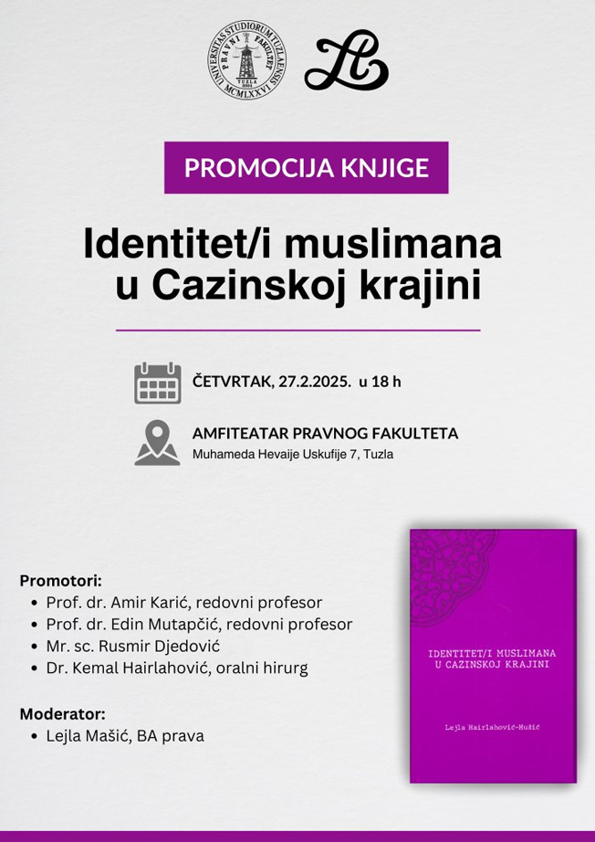 Najava promocije knjige “Identitet/i muslimana u Cazinskoj krajini” na Pravnom fakultetu Univerziteta u Tuzli by Mehmedović · 25. 02. 2025.
